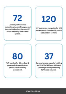 Key activities of the project include: Strengthening policies and regulatory environment to ensure social inclusion and effective ICF roll-out, Promoting social inclusion of persons with disabilities among wider public, Supporting disability assessment centres to assess greater number of persons with disabilities, Conducting post-assess and follow-up evidence-based services including individual service for persons with disabilities, Capacitating OPDs and their coalitions to make them capable agents of persons with disabilities at policy and service delivery levels, Supporting OPDs to design and launch innovative ICF post-assessment services as well as to conduct monitoring and feedback of services for persons with disabilities.